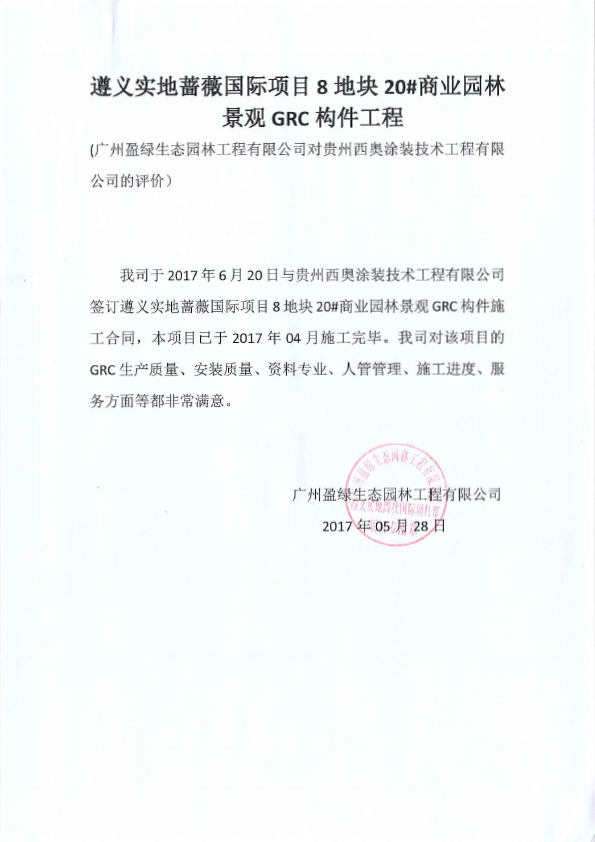在遵義實(shí)地薔薇國際項目商業(yè)園林景觀GRC構(gòu)件工程上廣州盈綠生態(tài)園林工程有限公司對我司提出的評價反饋:該項目自簽訂合同起至施工完畢,貴州西奧的GRC生產(chǎn)質(zhì)量、安裝質(zhì)量、資料專業(yè)、人員管理、施工進(jìn)度、服務(wù)等方面都非常滿意。