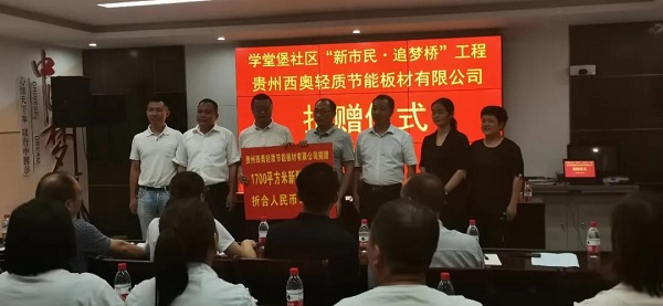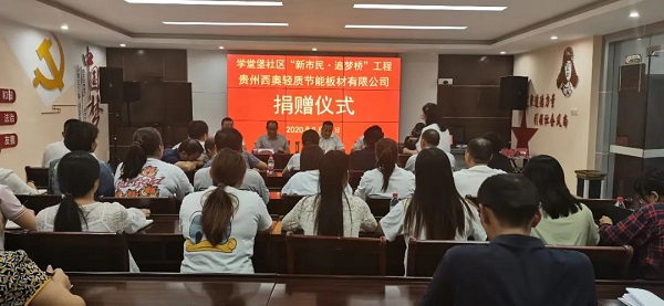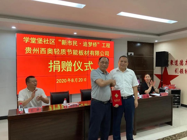 8月21日,貴州西奧董事長楊景龍代表西奧集團向匯川區高坪街道學堂堡社區“新市民·追夢橋”工程捐贈價值13萬元輕質節能墻板,用于社區群眾活動場所建設。遵義國家經濟技術開發區黨工委副書記、區委副書記、區委政法委書記龍通成、匯川區副區長王巍出席捐贈儀式并講話。