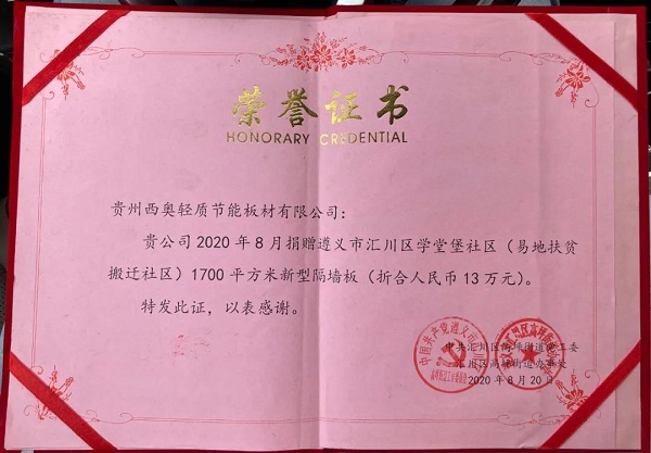 龍通成說,學堂堡社區是匯川安置搬遷群眾的新社區,在學堂堡社區當前建設的關鍵時刻,貴州西奧奉獻愛心,捐贈物資,讓學堂堡干部、群眾深切的感受到這份溫暖和情誼。他指出,學堂堡社區“新市民·追夢橋”工程必須打造成“樣板工程”,確保搬遷群眾“搬得出、穩得住、能致富”。貴州西奧捐贈的用完善安置點公共配套設施建設的墻板,必須本著不浪費的精神,用好這批物資。
