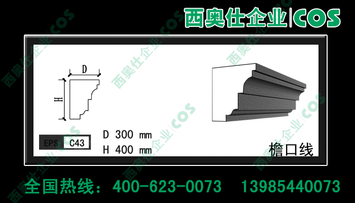 西奧仕(COS)EPS裝飾線條、構件是由脫模B2級防火的聚笨乙烯為主體,粘貼耐堿玻纖網格布,加以特殊的粘結外保護層復合而成
