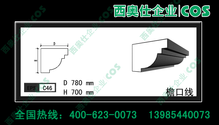 西奧仕(COS)EPS裝飾線條、構件是由脫模B2級防火的聚笨乙烯為主體,粘貼耐堿玻纖網格布,加以特殊的粘結外保護層復合而成