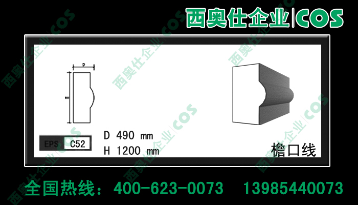 西奧仕(COS)EPS裝飾線條、構件是由脫模B2級防火的聚笨乙烯為主體,粘貼耐堿玻纖網格布,加以特殊的粘結外保護層復合而成