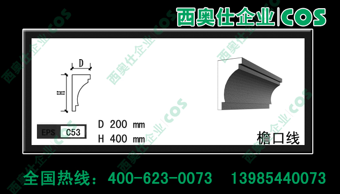 西奧仕(COS)EPS裝飾線條、構件是由脫模B2級防火的聚笨乙烯為主體,粘貼耐堿玻纖網格布,加以特殊的粘結外保護層復合而成