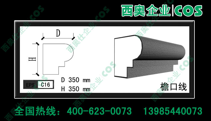 西奧仕(COS)EPS裝飾線條、構件是由脫模B2級防火的聚笨乙烯為主體,粘貼耐堿玻纖網格布,加以特殊的粘結外保護層復合而成