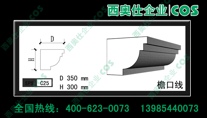 西奧仕(COS)EPS裝飾線條、構件是由脫模B2級防火的聚笨乙烯為主體,粘貼耐堿玻纖網格布,加以特殊的粘結外保護層復合而成