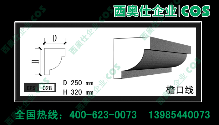 西奧仕(COS)EPS裝飾線條、構件是由脫模B2級防火的聚笨乙烯為主體,粘貼耐堿玻纖網格布,加以特殊的粘結外保護層復合而成