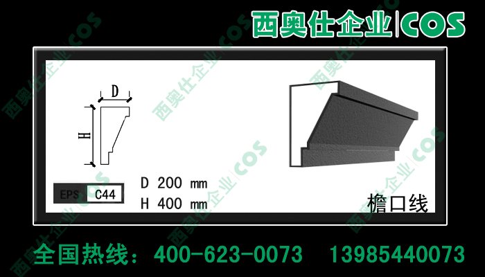 西奧仕(COS)EPS裝飾線條、構件是由脫模B2級防火的聚笨乙烯為主體,粘貼耐堿玻纖網格布,加以特殊的粘結外保護層復合而成