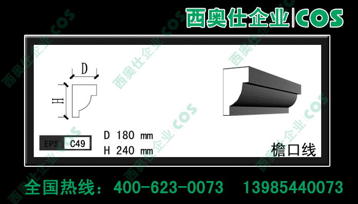 西奧仕(COS)EPS裝飾線條、構件是由脫模B2級防火的聚笨乙烯為主體,粘貼耐堿玻纖網格布,加以特殊的粘結外保護層復合而成