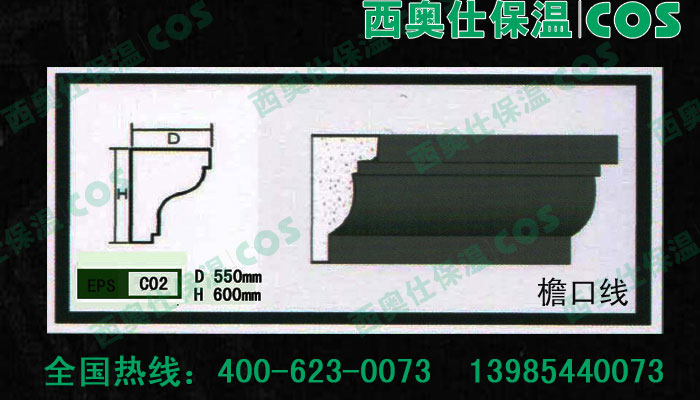 西奧仕(COS)EPS裝飾線條、構(gòu)件是由脫模B2級(jí)防火的聚笨乙烯為主體,粘貼耐堿玻纖網(wǎng)格布,加以特殊的粘結(jié)外保護(hù)層復(fù)合而成