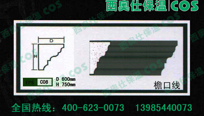 西奧仕(COS)EPS裝飾線條、構件是由脫模B2級防火的聚笨乙烯為主體,粘貼耐堿玻纖網格布,加以特殊的粘結外保護層復合而成
