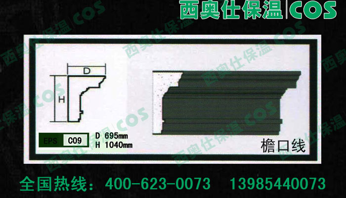 西奧仕(COS)EPS裝飾線條、構件是由脫模B2級防火的聚笨乙烯為主體,粘貼耐堿玻纖網格布,加以特殊的粘結外保護層復合而成